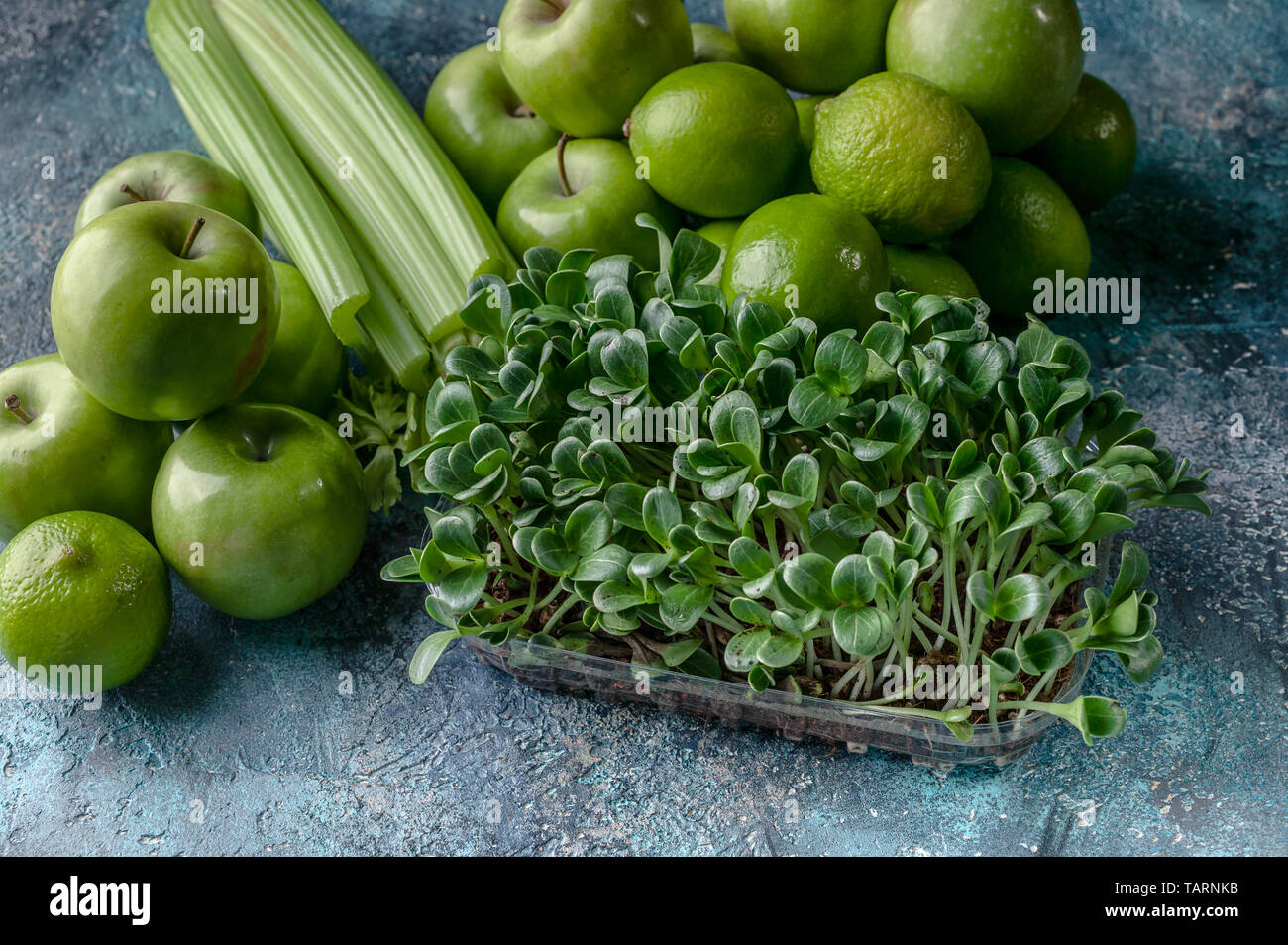 Green Apples Celery Limes And Milk Thistle Microgreen On A